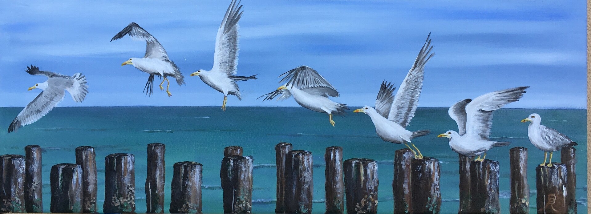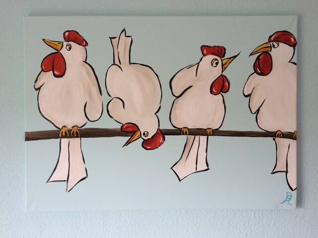 Dit zijn vogels geschilderd op stukken van steigerplanken. De ijzeren splijt strips fungeren nu als hekje voor de vogels, dit hangt op de logeerkamer van de kleinkinderen.