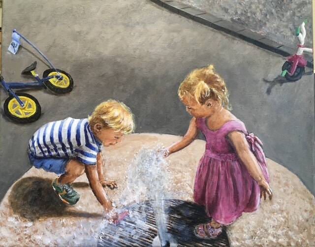 De kleinkinderen van onze oude overburen bij een fontein in Frankrijk.