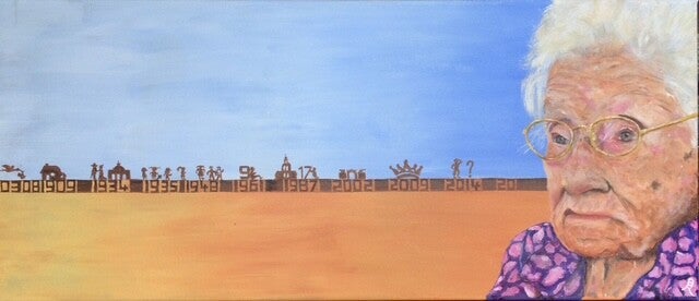 Mijn oma Raaijmakers is 108 jaar oud geworden, zij was toen de oudste van de provincie Brabant. Dit schilderij hangt in het ABG in Bergen op Zoom, waar ze het laatste gewoond heeft.