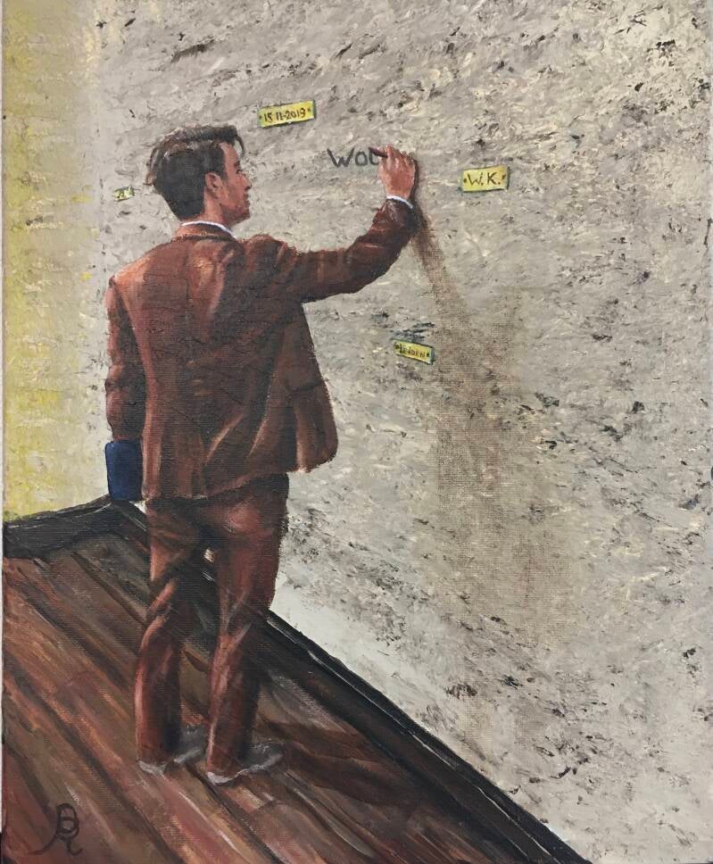 De opdracht was: groen schilderij met als enigste verf kleur, 2x blauw, 2x geel en wit. Het is een zelfportret geworden.