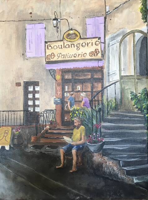 De plaatselijke bakker, van het franse dorpje Mirabel-aux-Baronnies, ik vond het een typisch frans plaatje. Èn het was ook de bakker waar we jaren ons brood haalde, ik heb het aan de bakkersvrouw gegeven, niet wetende dat de man op het bankje de bakker is. Het heeft jaren in de winkel gehangen.