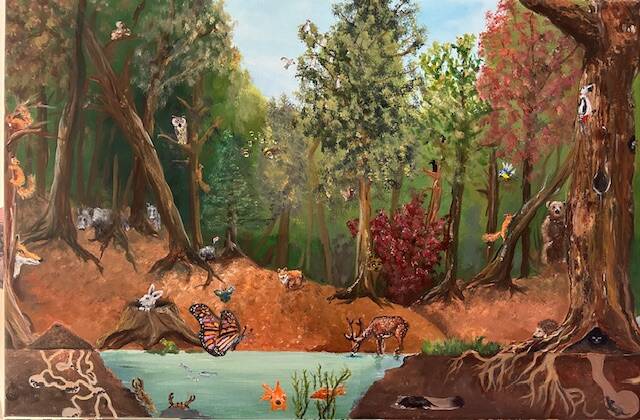 Mijn kleinzoon is houdt erg van bosdieren, hierop heb in een bos met ongeveer 40 dieren geschilderd om aan te wijzen en te zoeken.