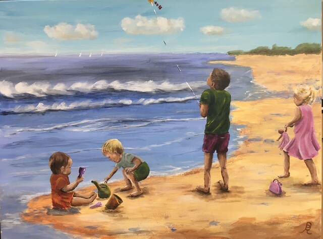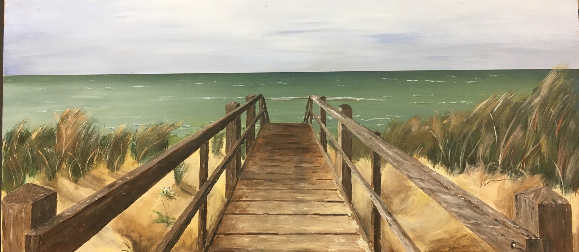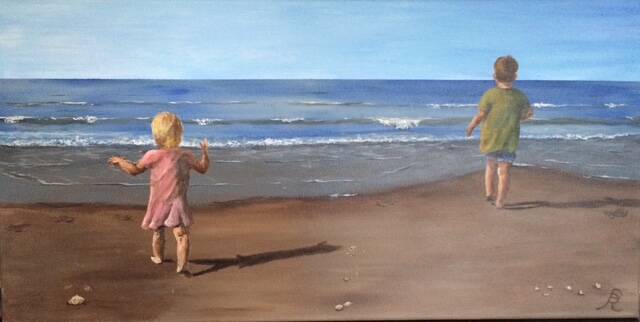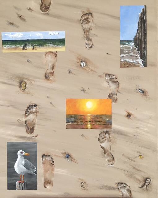 De voetstappen zijn vrienden van ons: Wilma en Jan de andere strand taferelen zijn ook op het doek geschilderd.